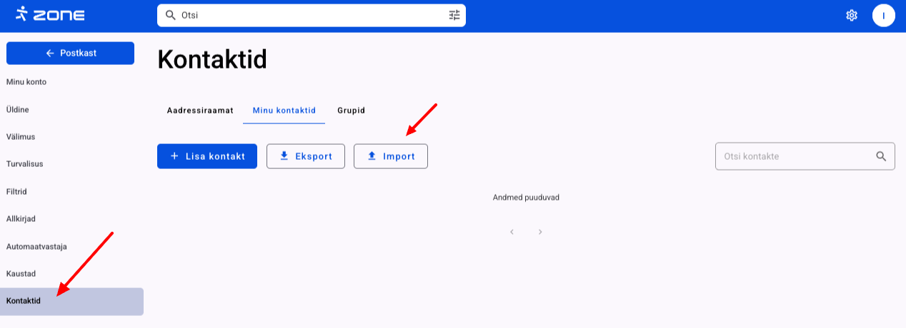 Kontaktide importimiseks vali Minu kontaktid ja Import.