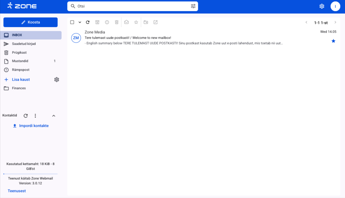 Kahe paani vaade kuvab vaid kaustade nimekirja ja kirjade loetelu. Kirjale klõpsates avaneb kiri teises paanis: