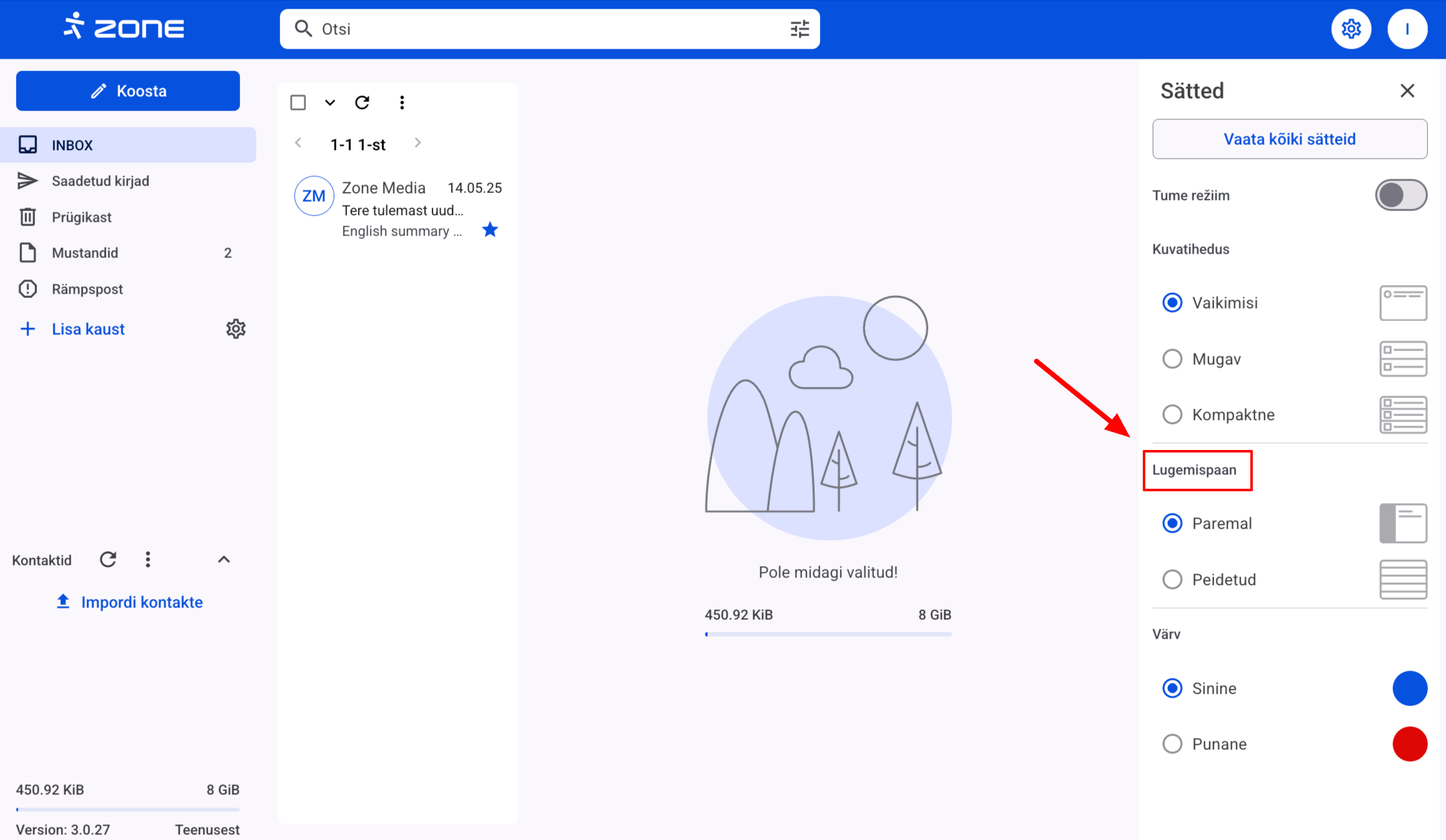 Sul on võimalik valida, millist postkasti vaadet sa eelistad. Vajuta paremal üleval hammasratta ikoonil ja valikus Lugemispaan saad valida kolme (Paremal) ja kahe paani (Peidetud) vahel.