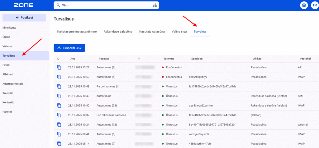Vajadusel saab kasutaja kontrollida, kust ja mis meetodil on tema e-posti konto vastu autenditud (või proovitud autentida). Selleks tuleb valida seadete all Turvalisus -> Turvalogi.