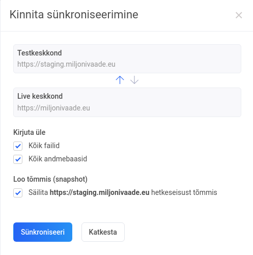 Alustades sünkroniseerimist avaneb aken, kus saab täpsustada, kas soovid üle kirjutada ainult failid või ka andmebaasid. Samuti on võimalik turvalisuse tagamiseks teha ülekirjutatavast rakendusest tõmmis enne sünkroniseerimist, mida saab kasutada ülekirjutatud rakenduse taastamiseks.