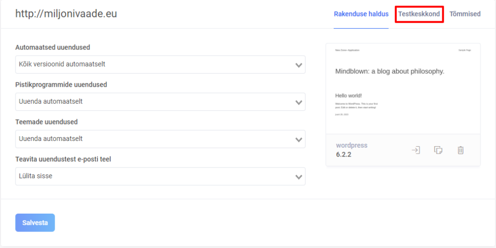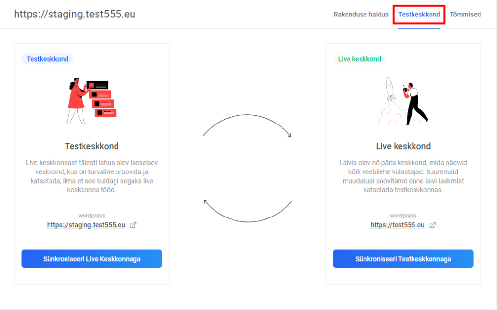 WordPressile on võimalik seadistada oma testkeskkond. See kujutab endast koopiat rakendusest, mis on seotud põhirakendusega, ning võimaldab andmete ja failide sünkroniseerimist kahe keskkonna vahel.