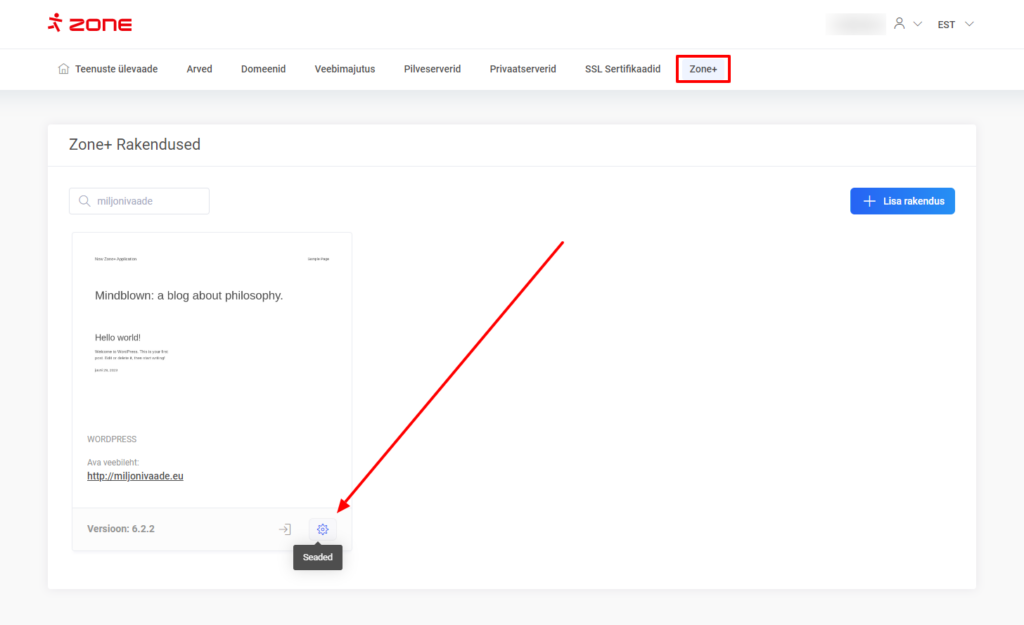 Kõigepealt ava ülemisest menüüst Zone+ ja leia rakenduste alt sobiv WordPressi rakendus, millele soovid luua testkeskkonna. Rakenduse vaates klõpsa nupul Seaded.