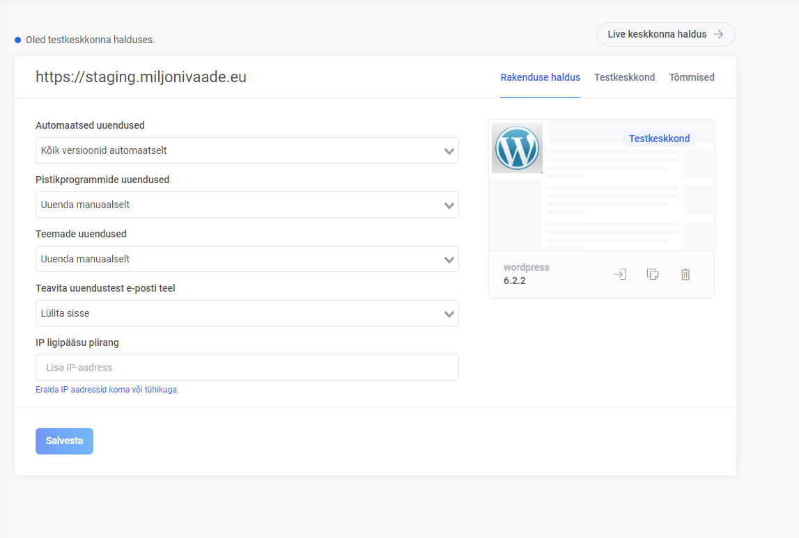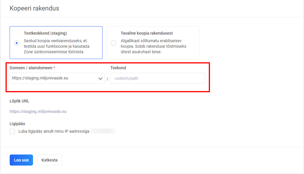 Avaneb leht rakenduse kopeerimiseks, kus on valitud kopeerimise tüübiks Testkeskkond (staging). Siin vali rippmenüüst Domeen / alamdomeen sobiv alamdomeen, kuhu soovid paigaldada põhirakendusest koopia. Teekond lahter võib vaikimisi tühjaks jääda, kuid seda saab kasutada, kui soovid paigaldada rakenduse koopia alamkataloogi. Allpool on võimalus piirata ligipääsu ainult enda IP-aadressile. IP-põhist piirangut saab seadistada ka pärast testkeskkonna loomist.