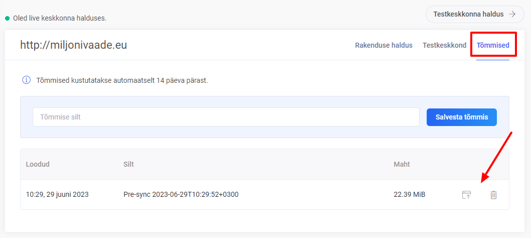 Avanenud vaates on võimalik mõlemat pidi kopeerida: nii testkeskkonnast põhirakendusse kui ka põhirakendusest testkeskkonda.