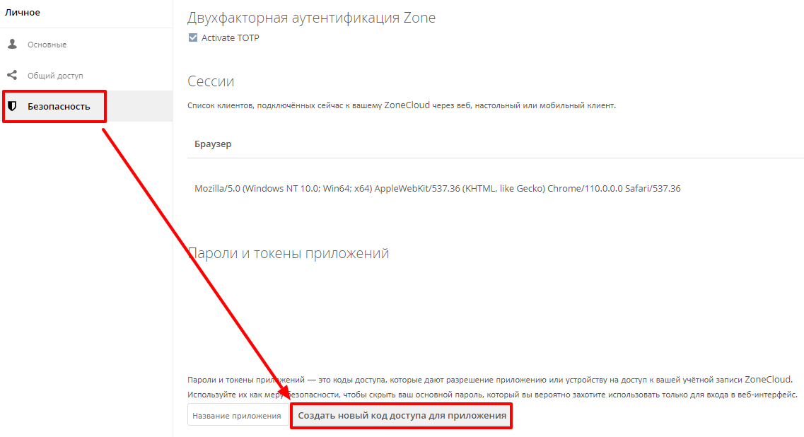 Для того, чтобы после активации 2FA было возможно войти через приложение ZoneCloud, следует сгенерировать на странице ZoneCloud отдельно пароль приложения. При входе на сайт ZoneCloud.ее будет запрошен 2FA TOTP код. Это тот же код, что и для входа в webmail.ee. После удачного входа нажмите на ваш почтовый адрес наверху справа и затем выберите Настройки -> Безопасность. Введите в поле название приложения (например ZoneCloudPC) и нажмите на Создать новый код доступа для приложения.