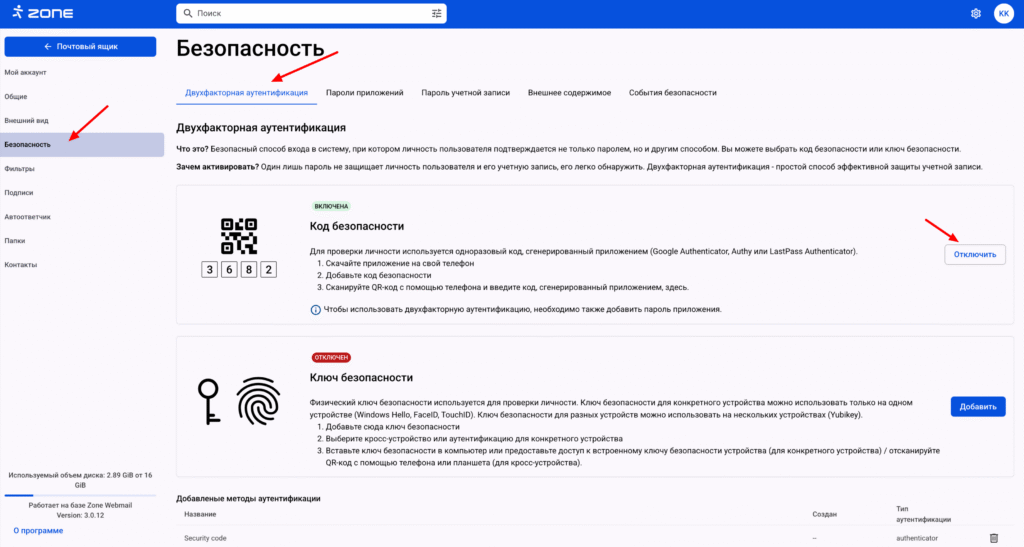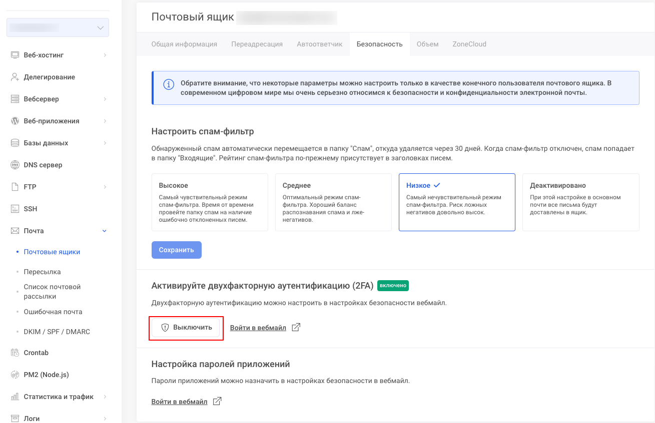 2FA можно всегда отключить в панели управления хостингом, нажав в окошке с настройками конкретного почтового ящика под категорией Безопасность на  кнопку “Выключить”.
