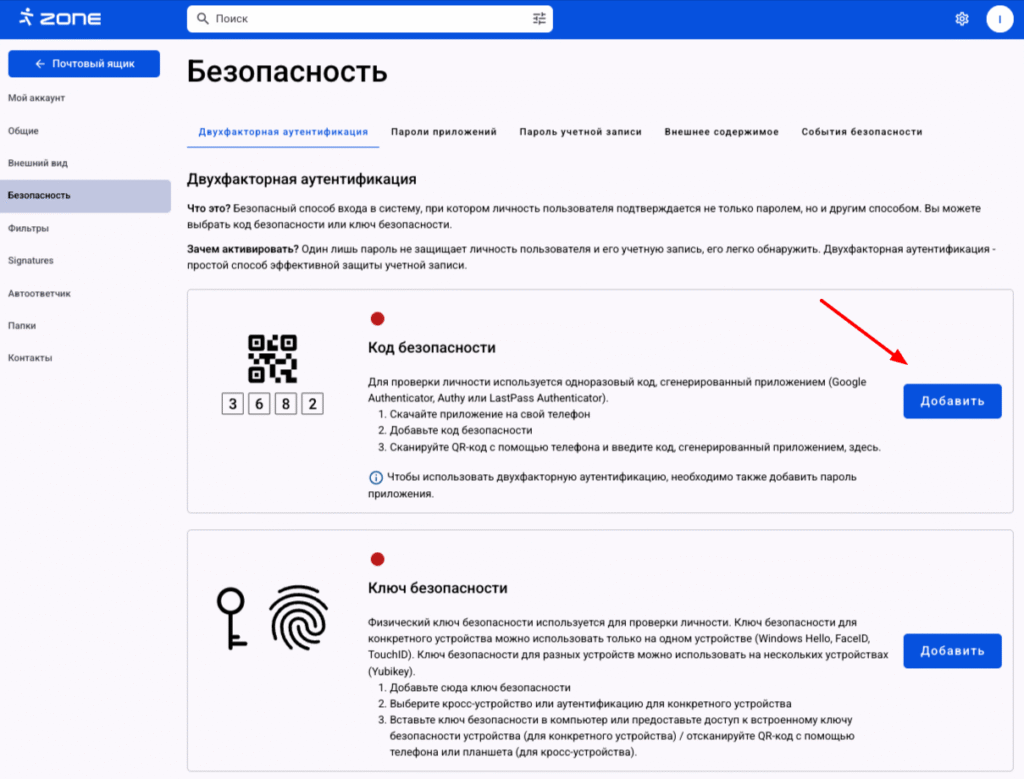 После активации 2FA, webmail.ee, а также ZoneCloud будет при входе запрашивать TOTP код. Вход через IMAP, POP3, SMTP и приложение ZoneCloud при помощи стандартного пароля невозможен.