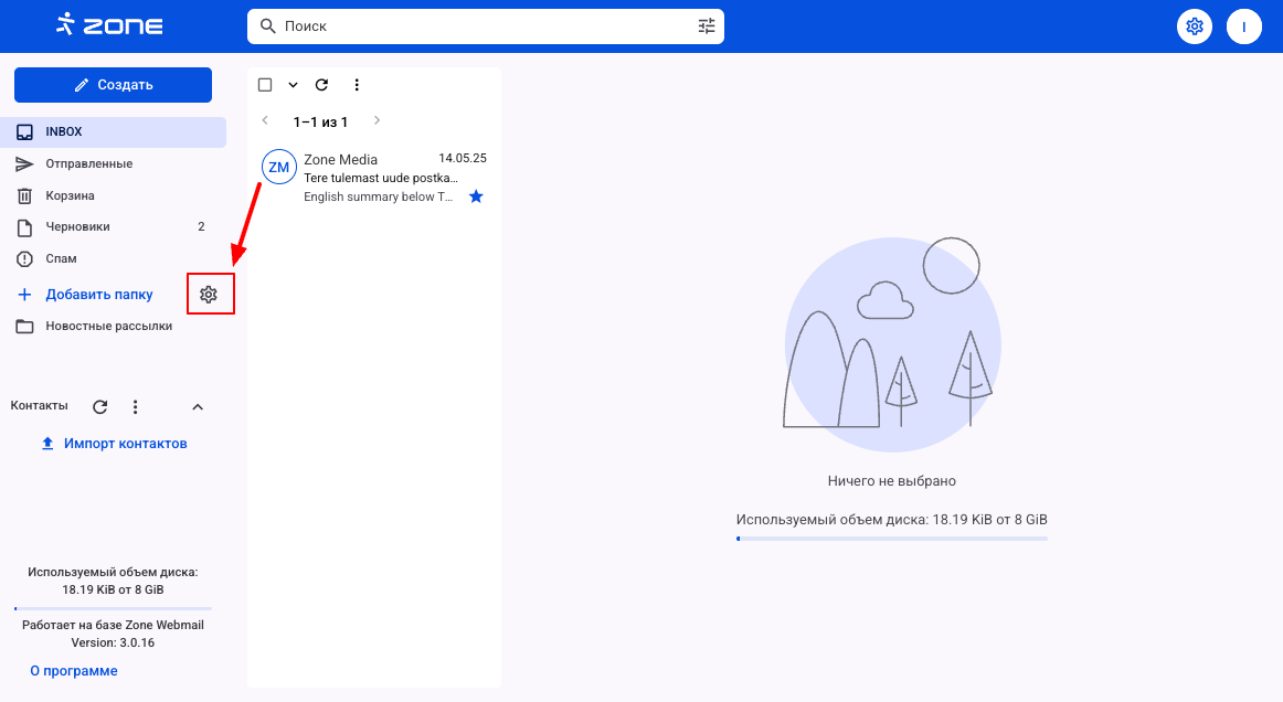 Настройки папок можно изменить, нажав на шестеренку на главной странице веб-почты: