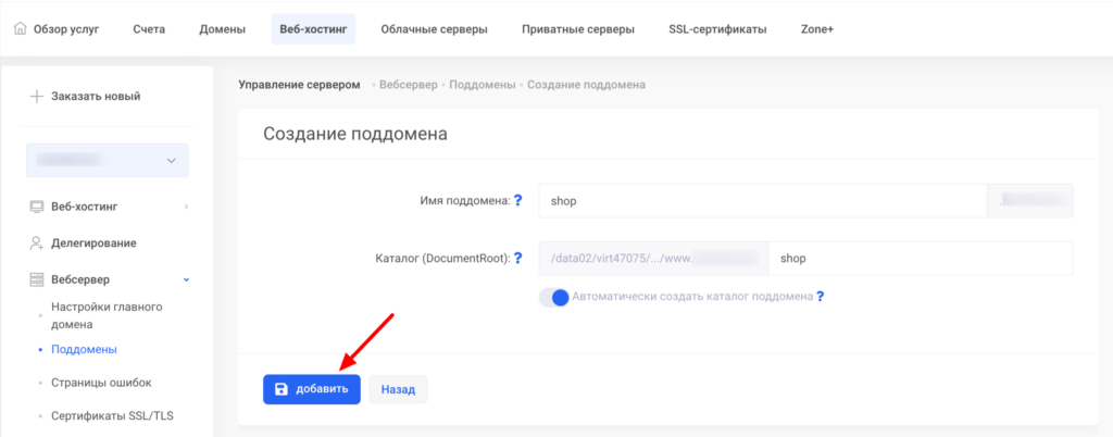 По умолчанию каталог имени поддомена добавляется автоматически, но если вы хотите добавить каталог/директорию вручную, то выбор Автоматически создать каталог поддомена следует деактивировать.