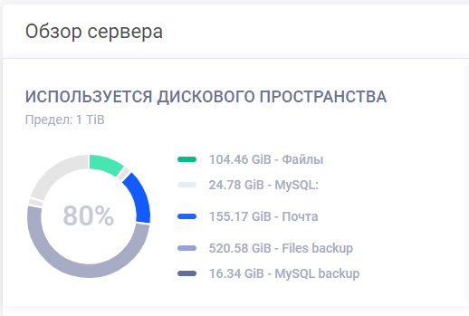 Здесь можно подробно посмотреть, сколько места занимает тот или иной компонент от общего дискового пространства. Перечислены все категории, общий объем и используемый объем на сервере.
