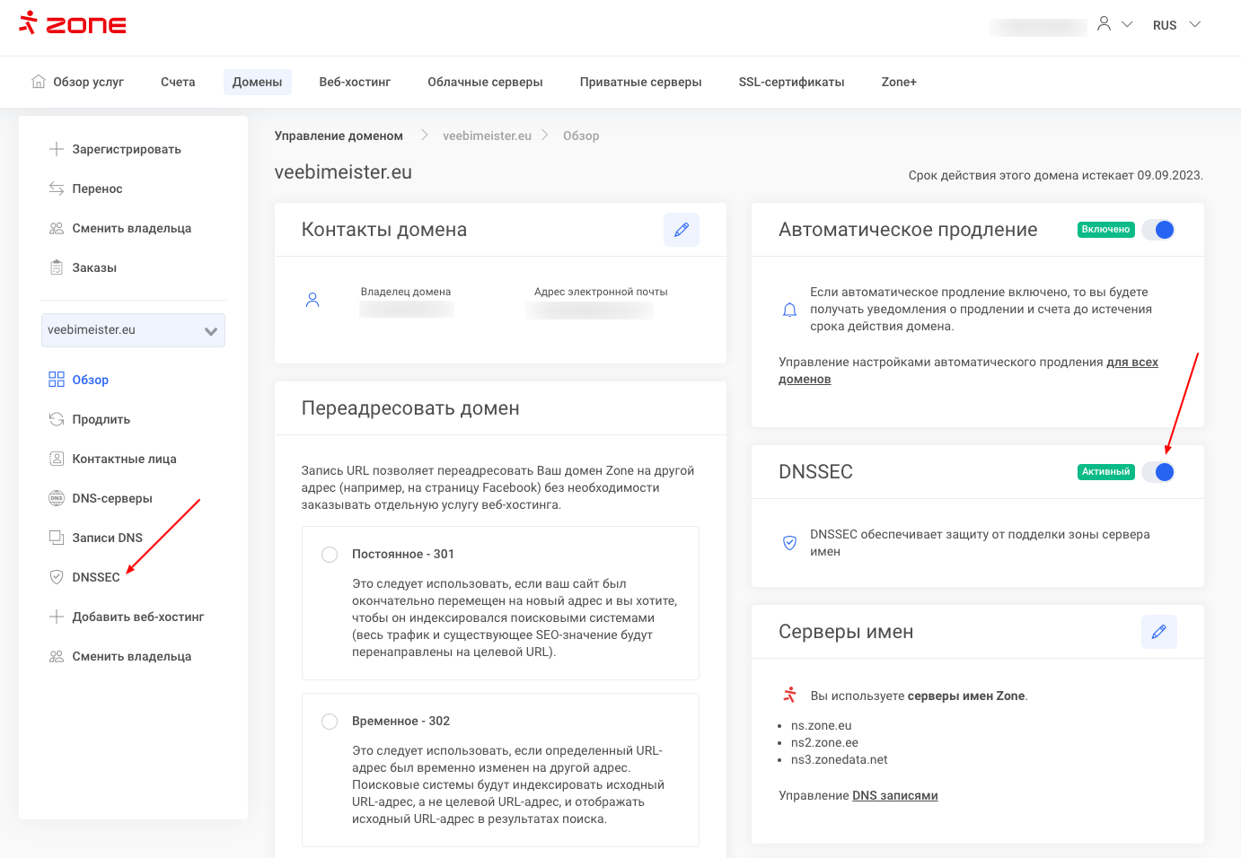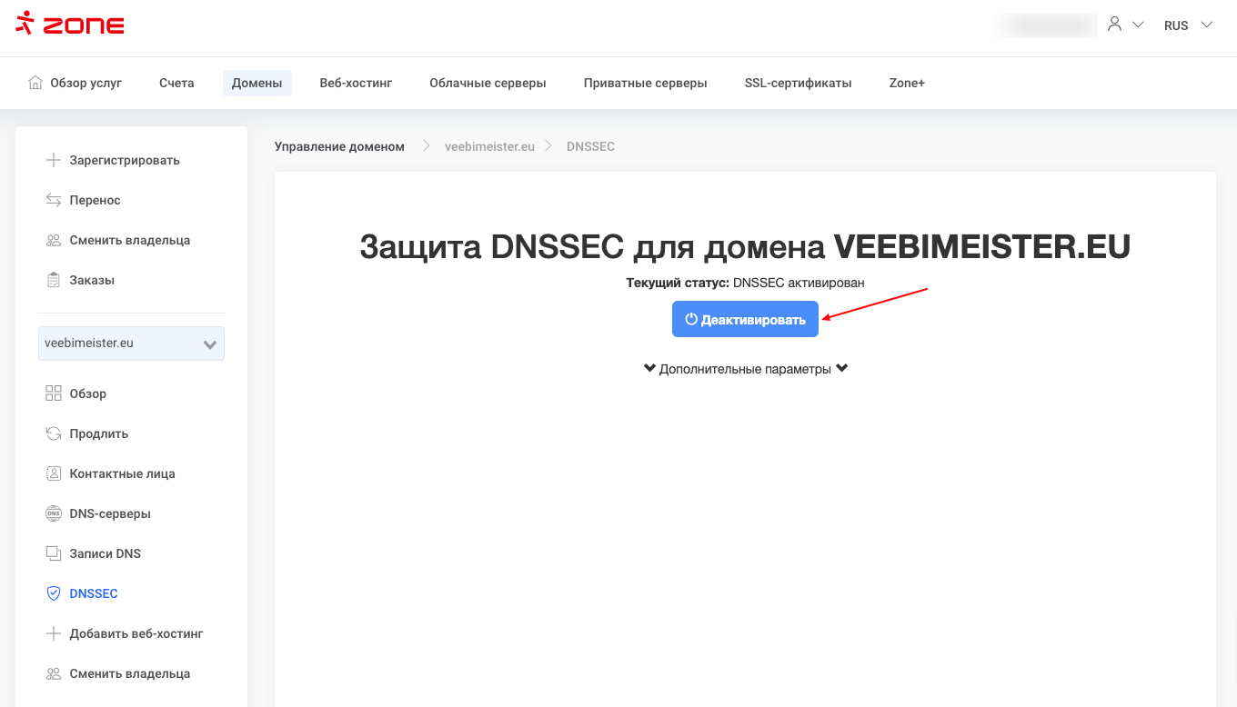 DNSSEC можно деактивировать через панель управления “Мой Zone”, нажав на соответствующее имя домена на странице Обзора услуг.