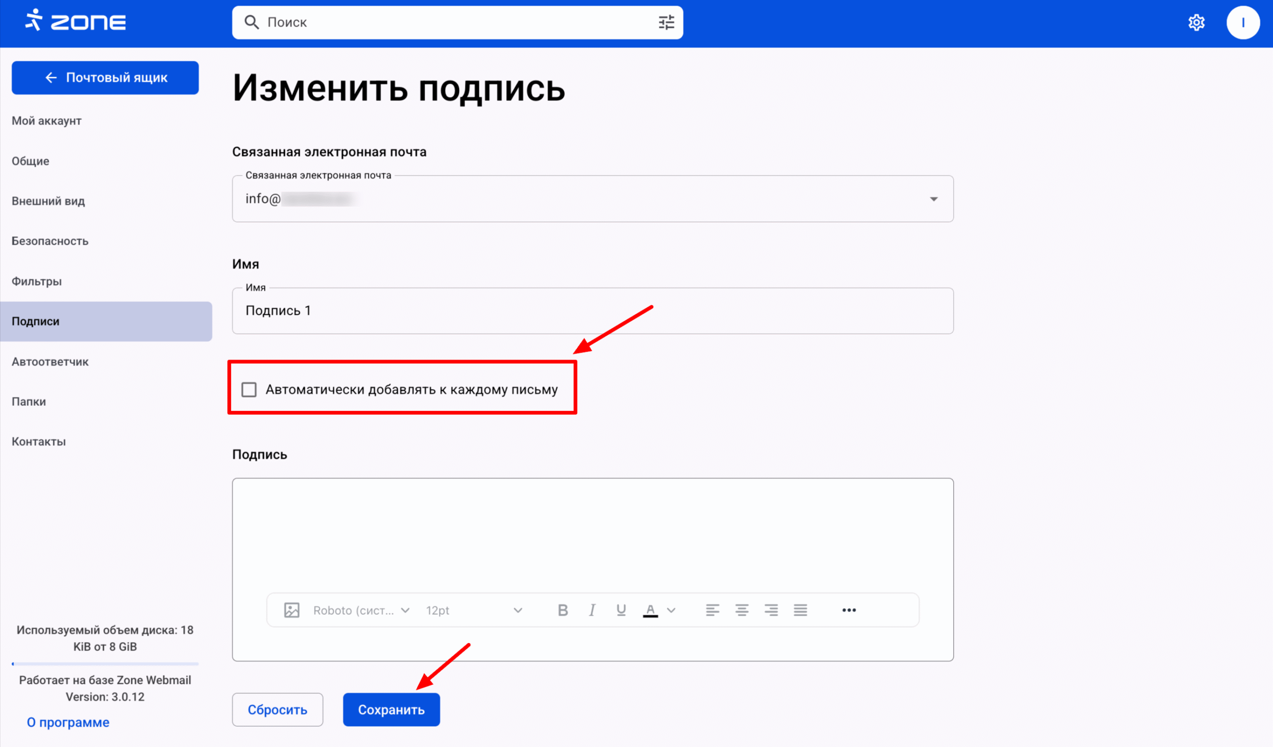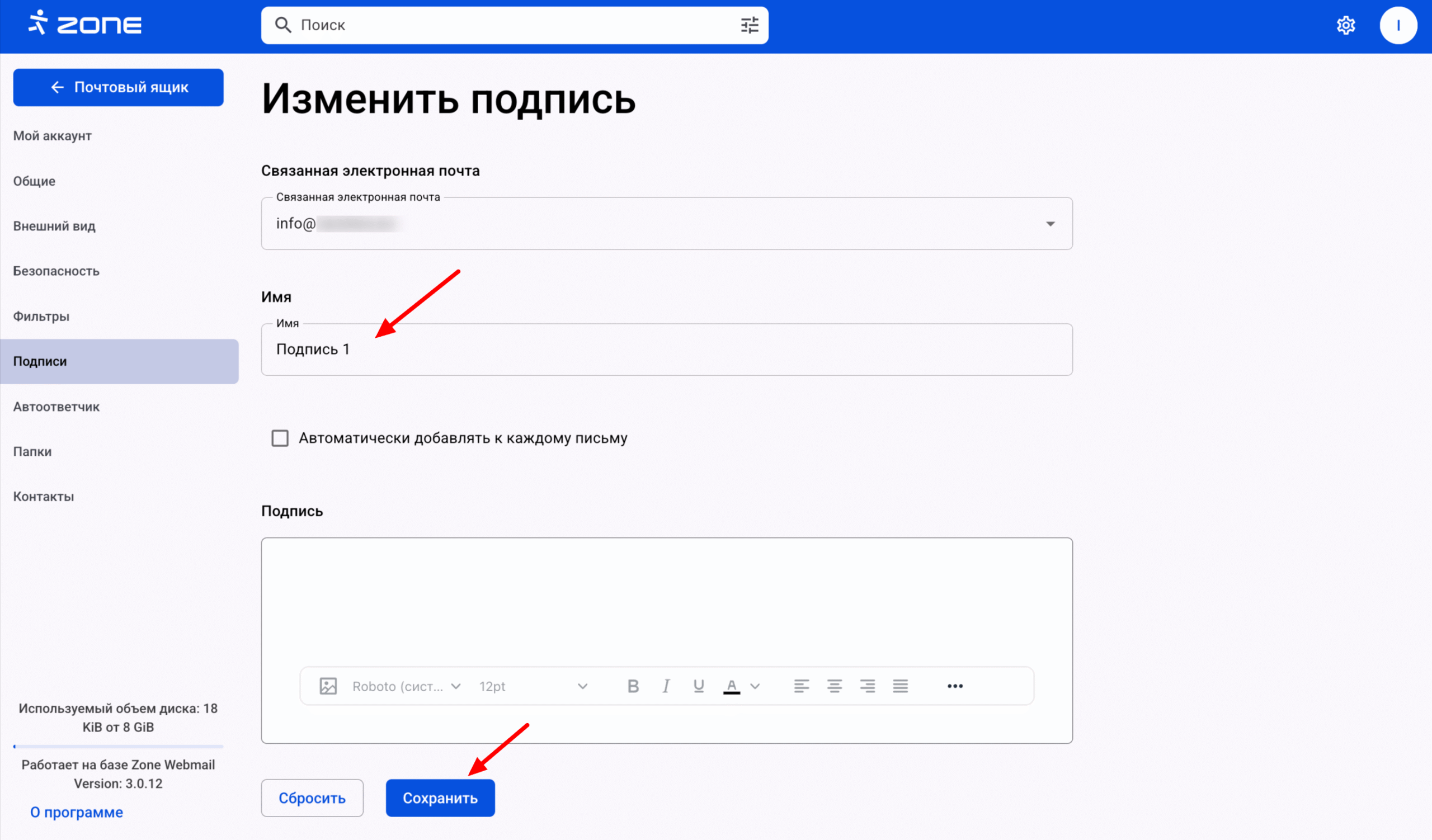 Нажмите кнопку Сохранить, чтобы сохранить подпись.