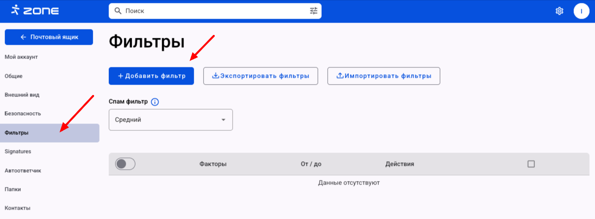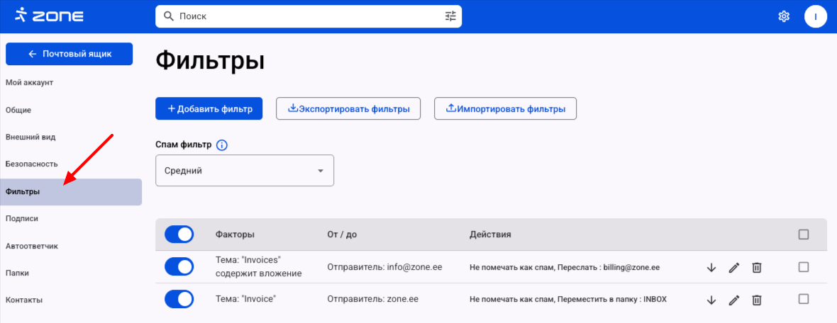 В веб-почте Zone webmail.ee можно настроить фильтры электронной почты на уровне сервера.