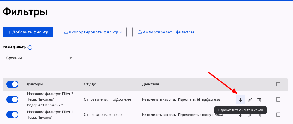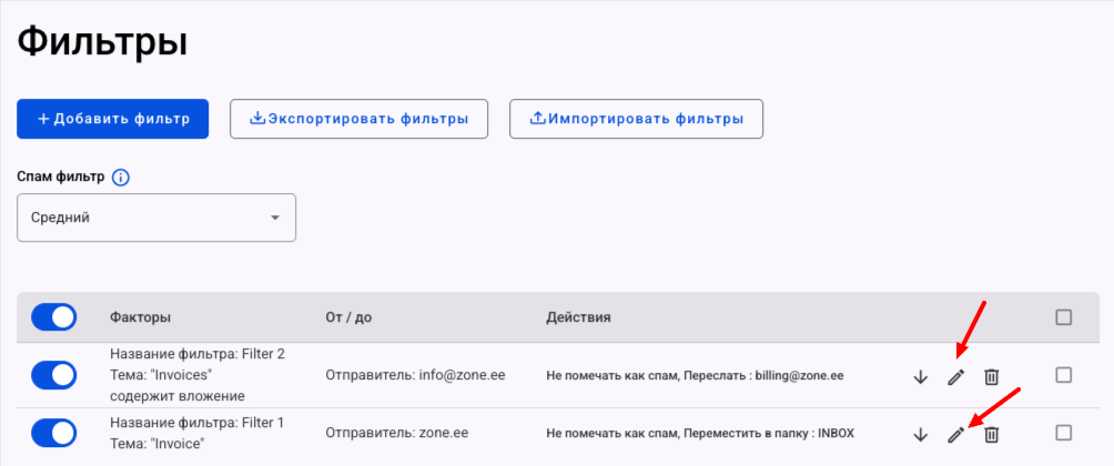 Созданные фильтры можно также редактировать, отключать или удалять. Для изменения фильтра нажмите на иконку карандаш.