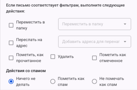 Действия, применяемые к отфильтрованным письмам