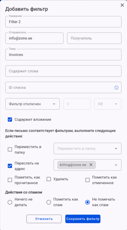 Если вы хотите всегда получать письма, например, от zone.ee без участия спам-фильтра, вам нужно создать следующий фильтр.