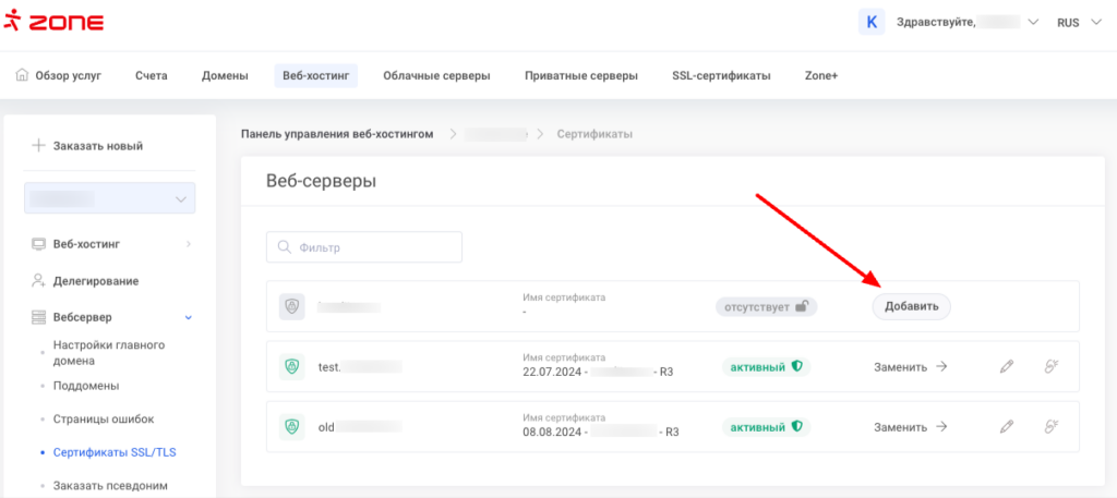 Заказать сертификат Let’s Encrypt возможно в административной панели Мой Zone под меню Веб-хостинг -> Вебсервер -> Сертификаты SSL/TLS. Около соответствующего домена нажмите Добавить