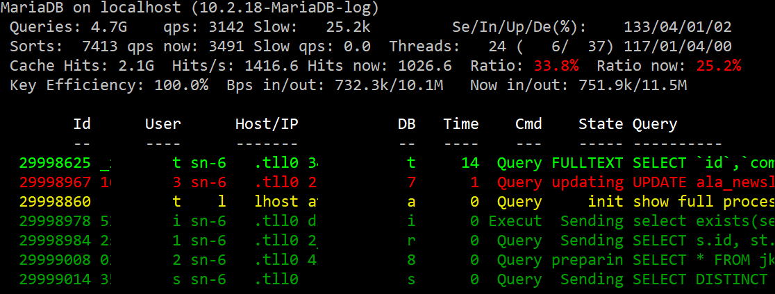 Для того, чтобы удобно различать запросы на чтение и запись, все запросы SELECT имеют зеленый цвет, а запросы UPDATE/DELETE/ALTER – красный. Все остальные запросы – желтые. Если запрос выполняется более 10 секунд, цвет изменится на светло-зеленый или светло-красный соответственно. Чтобы увидеть цвета, клиент SSH должен поддерживать цвета ANSI. Чтобы включить или выключить цвета, нажмите клавишу ‘C’.