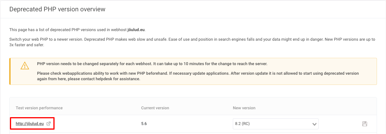 Поскольку изменение версии PHP может привести к появлению сообщений об ошибках на сайте, а изменение версии может занять до 3 минут, рекомендуется проверить работоспособность страницы перед внесением изменений.