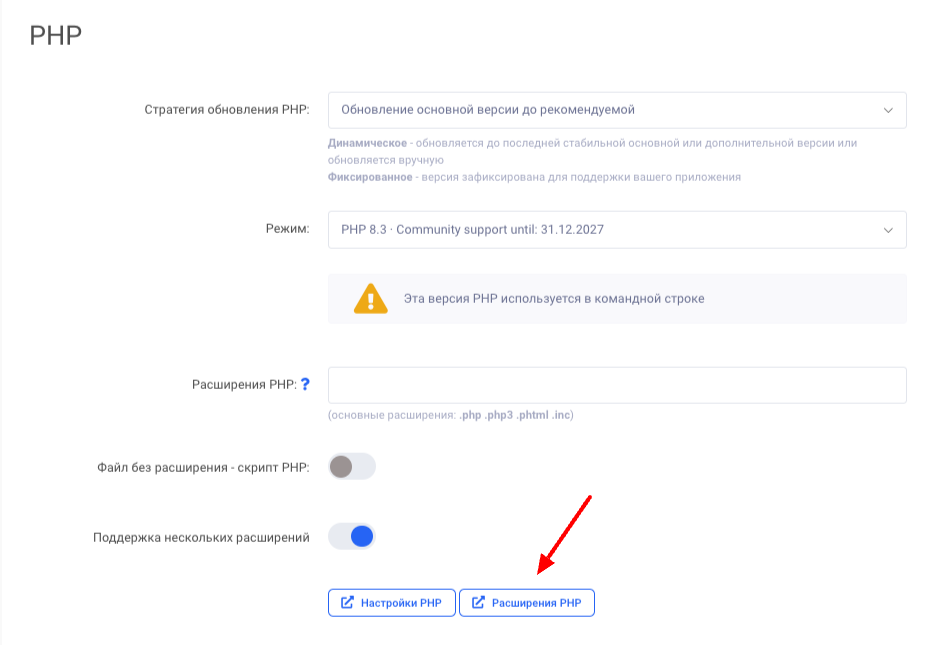 Изменение расширений PHP управление сервером