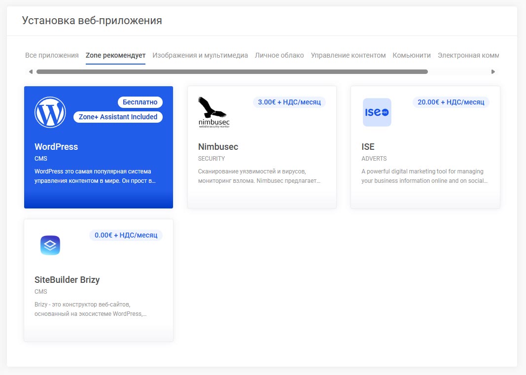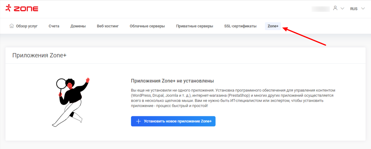 Для установки приложения, сначала необходимо войти в панель управления Мой Zone и выбрать в верхнем меню Zone+