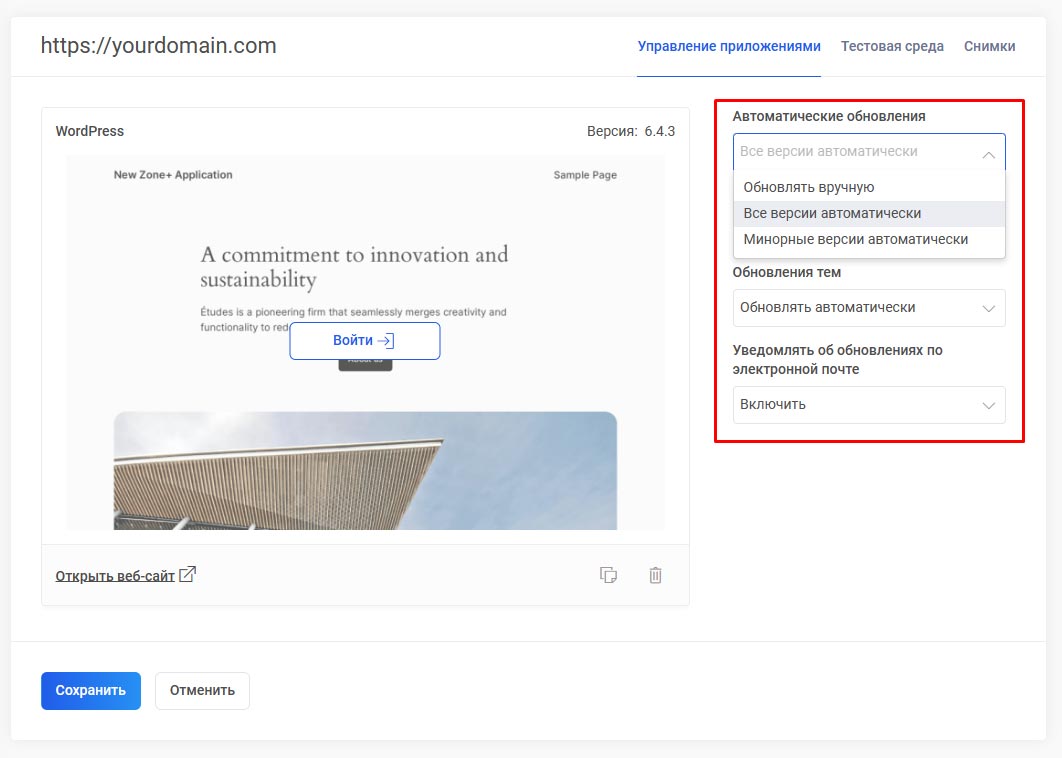 По умолчанию для всех приложений, установленных через Zone+, автоматические обновления включены в полном объеме. При необходимости можно изменить политику обновлений, выбрав например “Незначительные обновления версий (minor)” или же полностью отключить обновления.