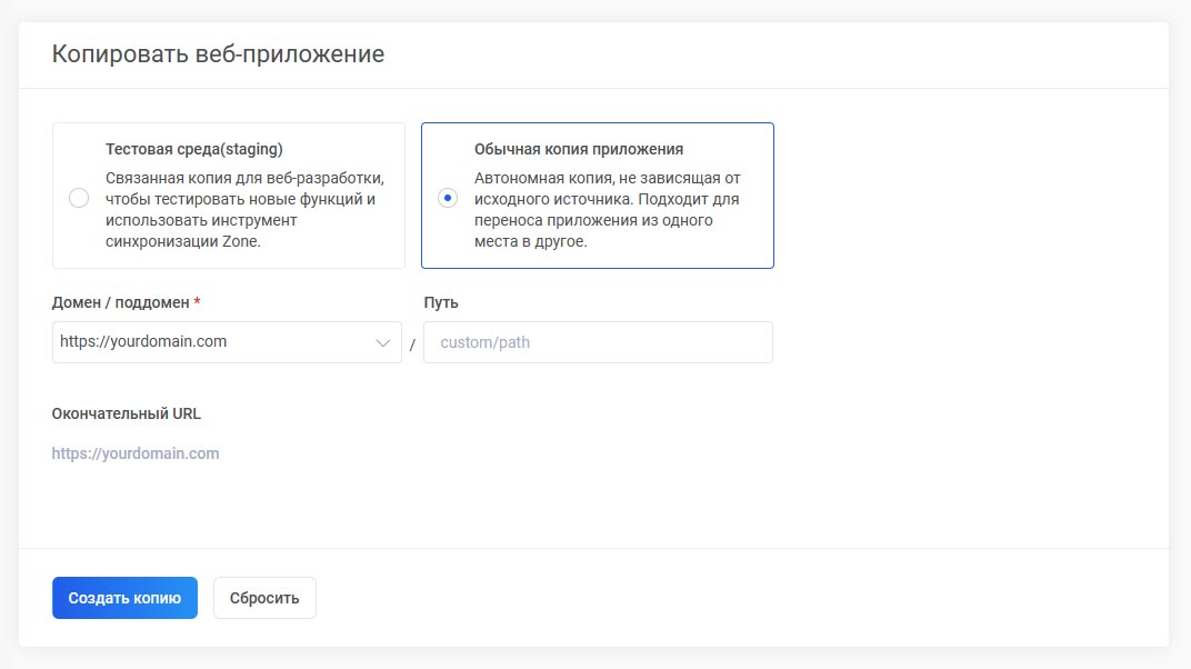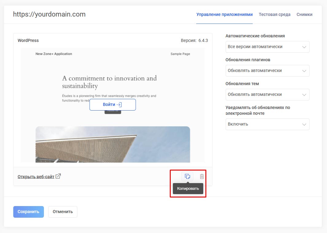 Для того, чтобы скопировать приложение в меню Веб-хостинг выберите Веб-приложения –> Мои приложения и нажмите за копируемым приложением Настройки приложения