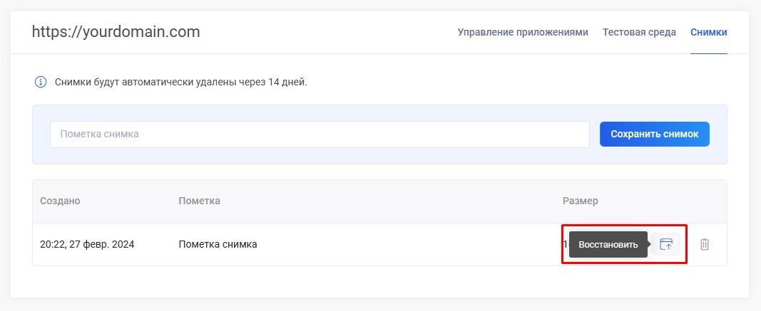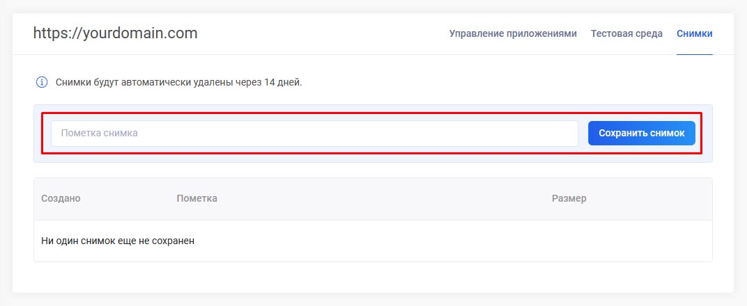 Для создания снимка нынешнего состояния сайта, установленного через Zone+ приложения, нажмите на кнопку Сделайте снимок в настройках приложения. В процессе создается архив файлов и базы данных сайта. Снимки хранятся на виртуальном сервере в папке zoneplus_snapshots в течение 14 дней.