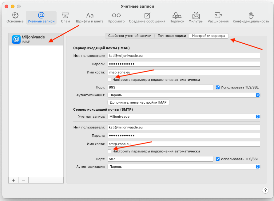 Уберите галочку из графы Настроить параметры подключения автоматически для Сервер входящей почты (IMAP) и Сервере исходящей почты (SMTP), чтобы просмотреть более подробные настройки.