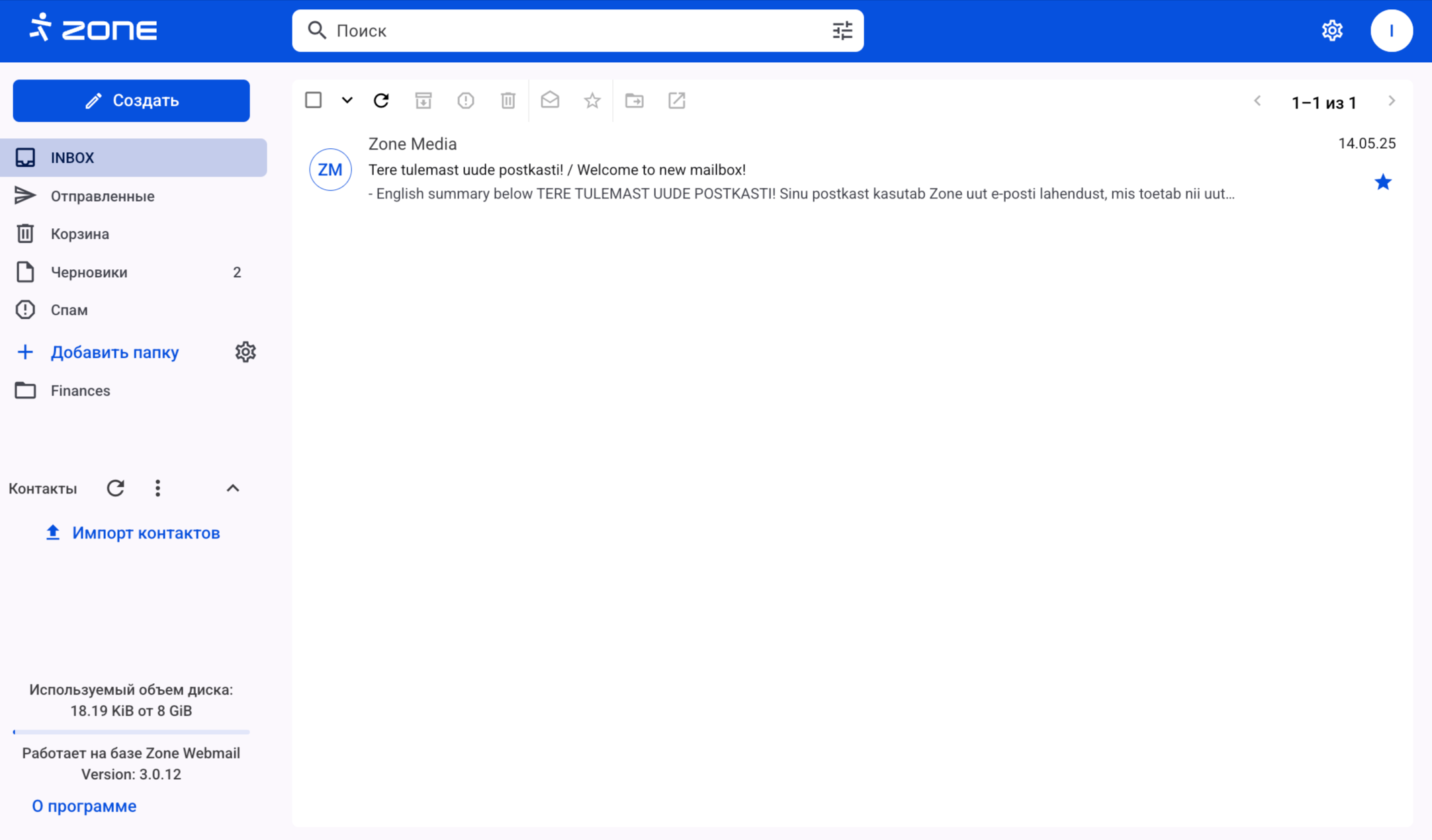 По умолчанию в Webmail используется трехпанельный вид экрана.