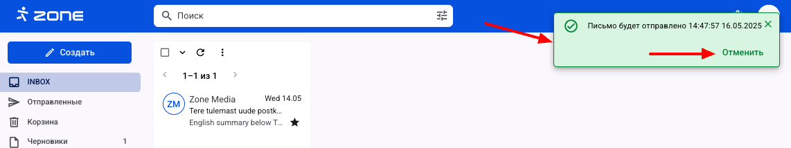 При отправке письма вы увидите сообщение Письмо будет отправлено вместе со временем и датой, и рядом сообщение Отменить. В зависимости от выбранного времени отправку можно отменить. Отмененное письмо перемещается в папку  Черновики.