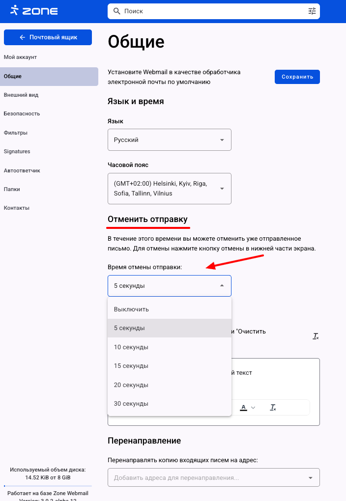 В разделе Общие и Отменить отправку вы можете настроить отмену отправки письма.