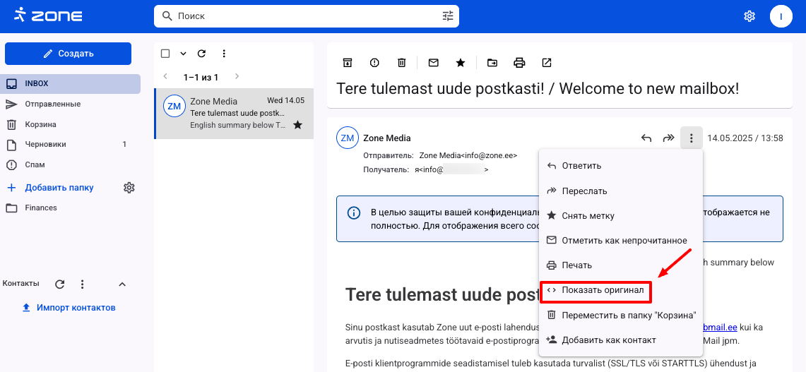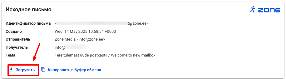 Иногда поддержка Zone просит передать поступившее вам (или отправленное вами) проблемное письмо в виде .eml файла. Этот файл нужен для проверки заголовок письма.