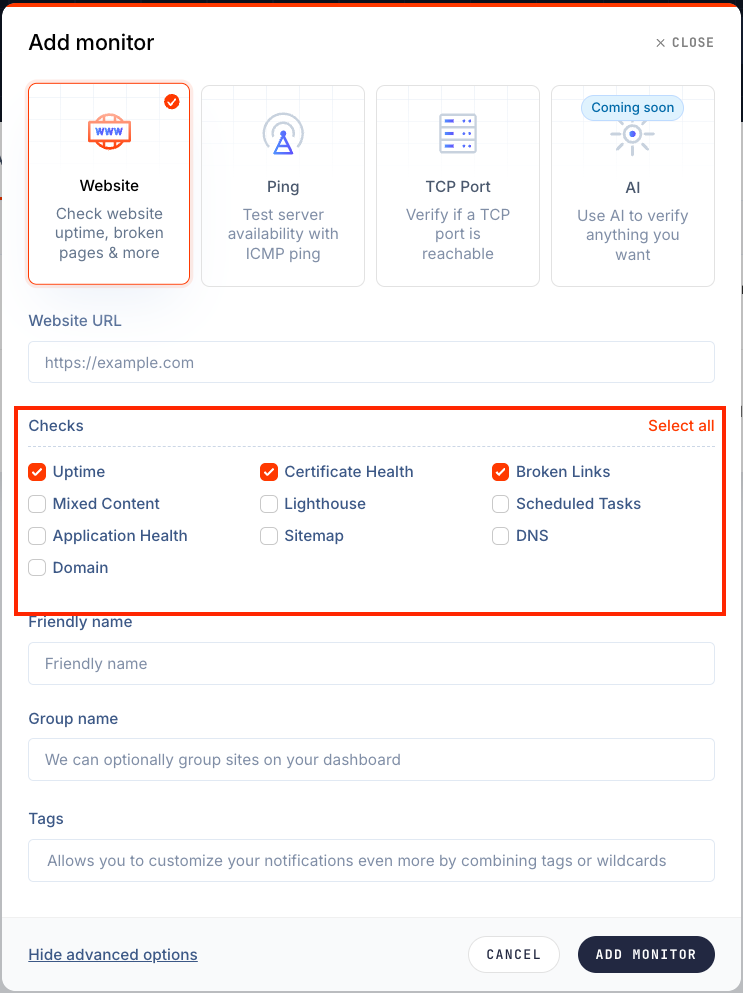 NB! Во время настройки можно выбрать стандартные проверки или добавить дополнительные (например, Mixed Content, Scheduled Tasks, Sitemap и др.).
