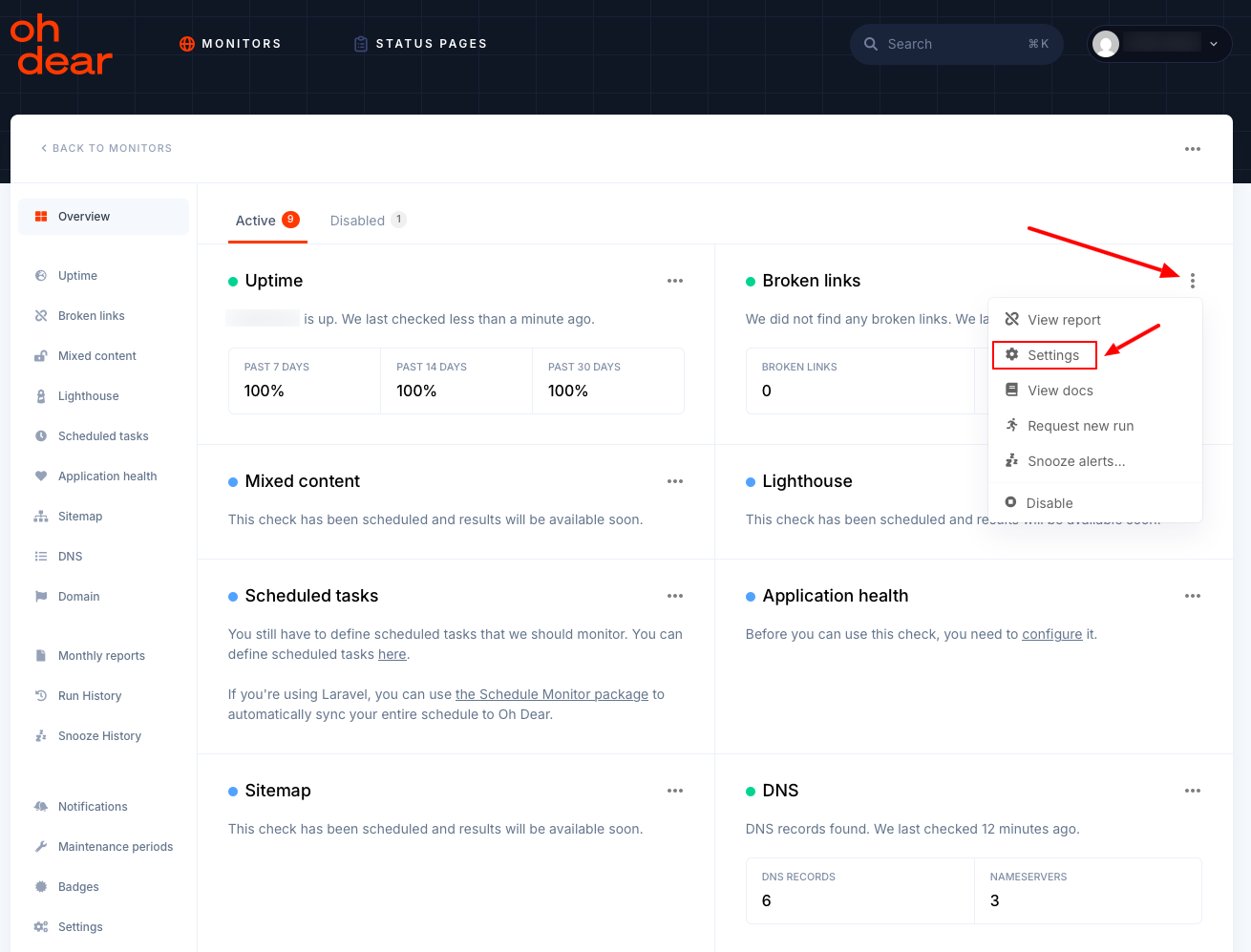 Чтобы включить проверку мониторинга, перейдите на страницу Monitors, нажмите на три точки (меню «kebab») рядом с нужным монитором и выберите Settings.