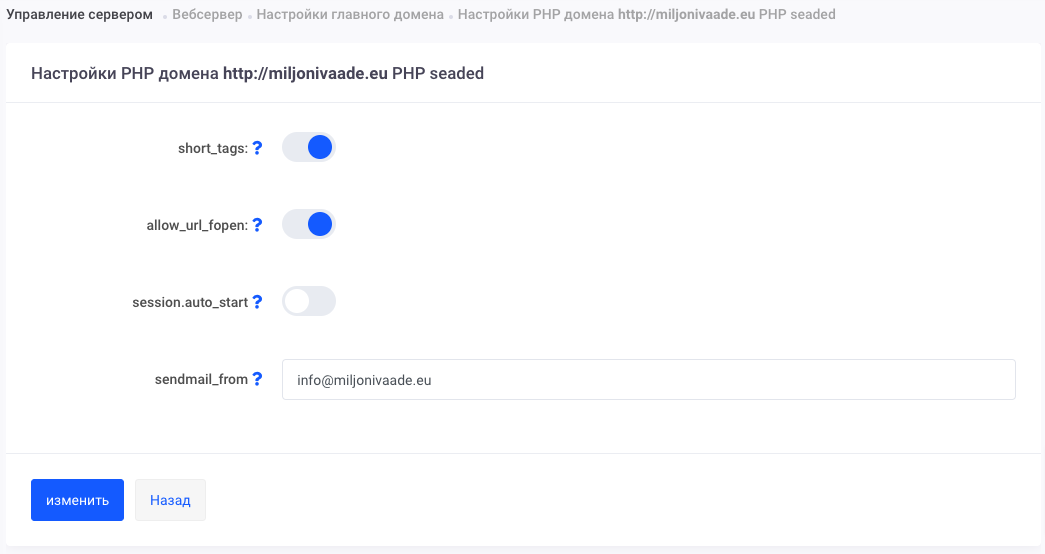 В открывшемся окне измените значение sendmail_from. Необходимо ввести только электронный адрес в формате address@example.com.