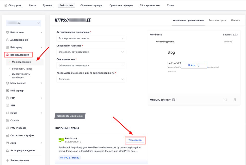 Для установки выберите в среде Мой Zone раздел Веб-хостинг (если у вас несколько хостингов, выберите тот, куда хотите установить Patchstack), затем Веб-приложения, Мои приложения, и в разделе Плагины и темы нажмите Установить.