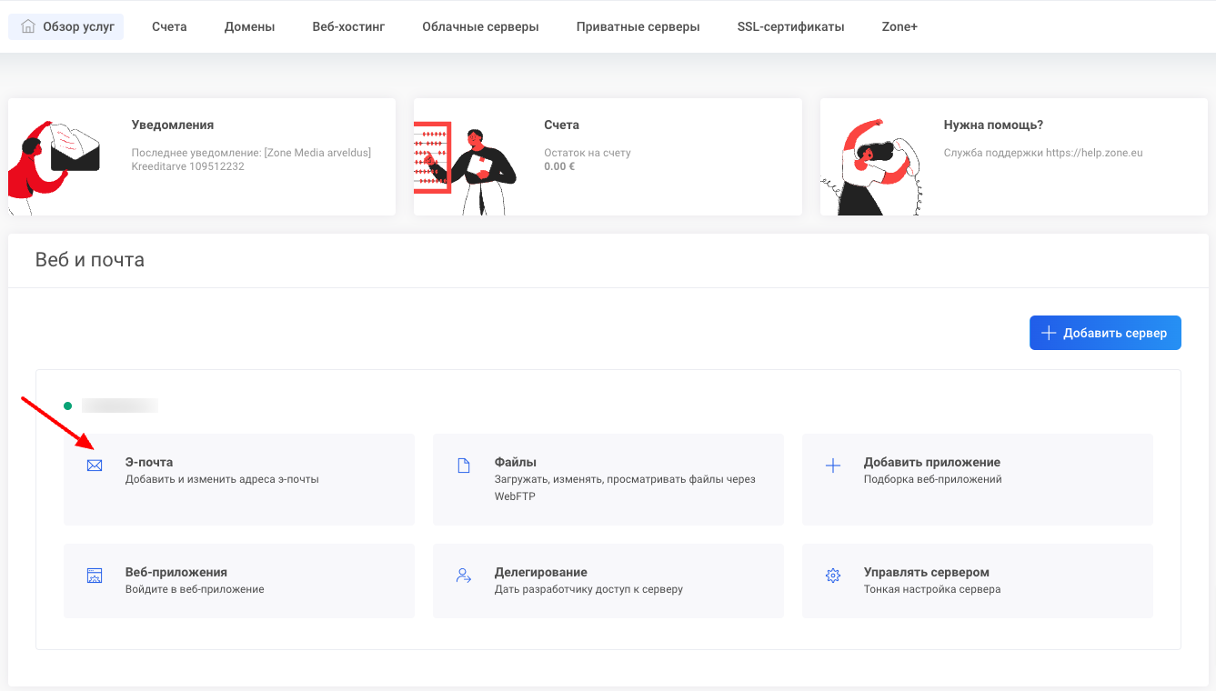 Для переадресации ошибочной почты войдите в панел управления  Мой Zone. Войдя в систему используя свой ZoneID аккаунт, выберите раздел Вебхостинг и Э-почта.