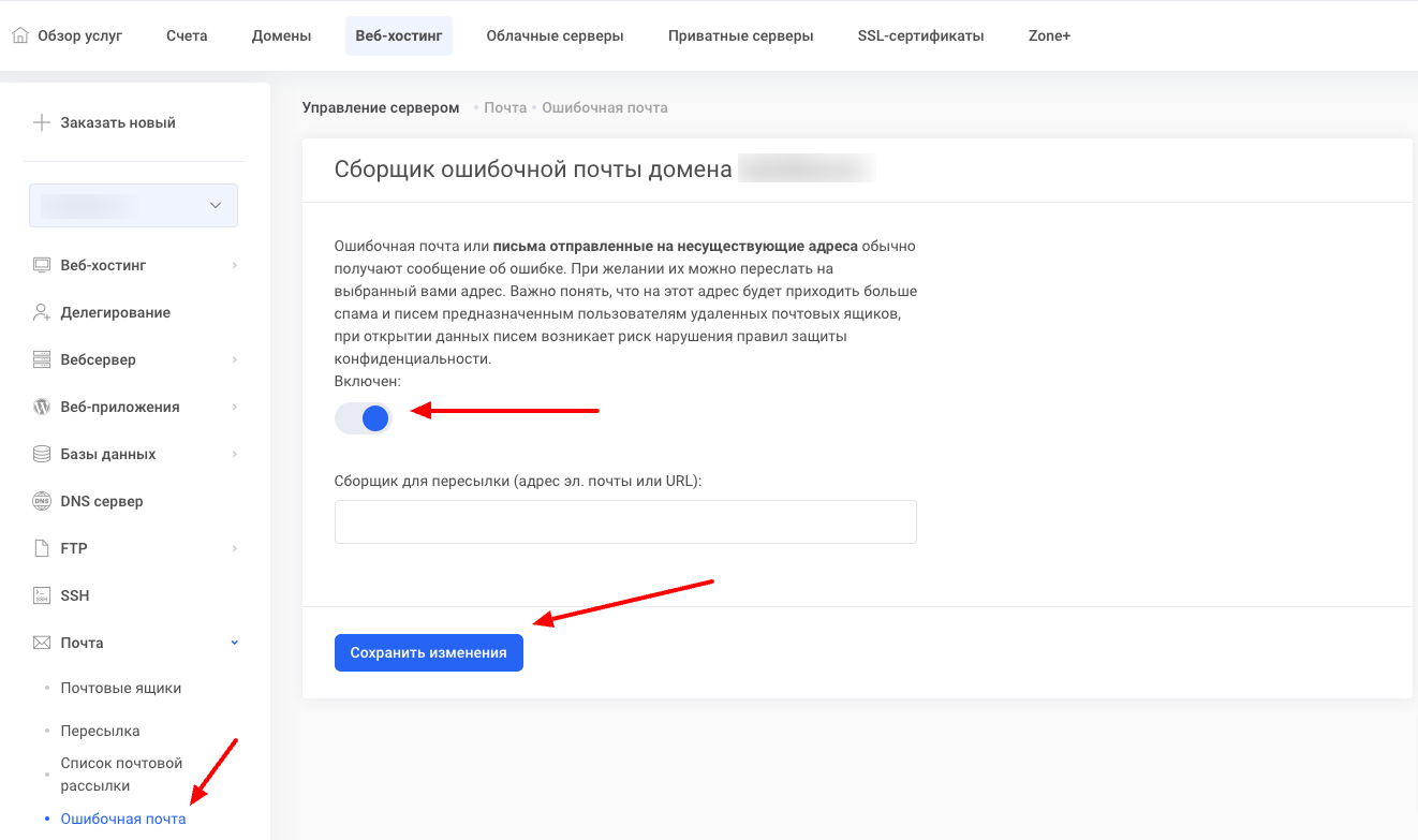 Затем слева в меню выберите  Ошибочная почта . Активируйте функцию, введите адрес, на который нужно пересылать ошибочную почту, и сохраните изменения.