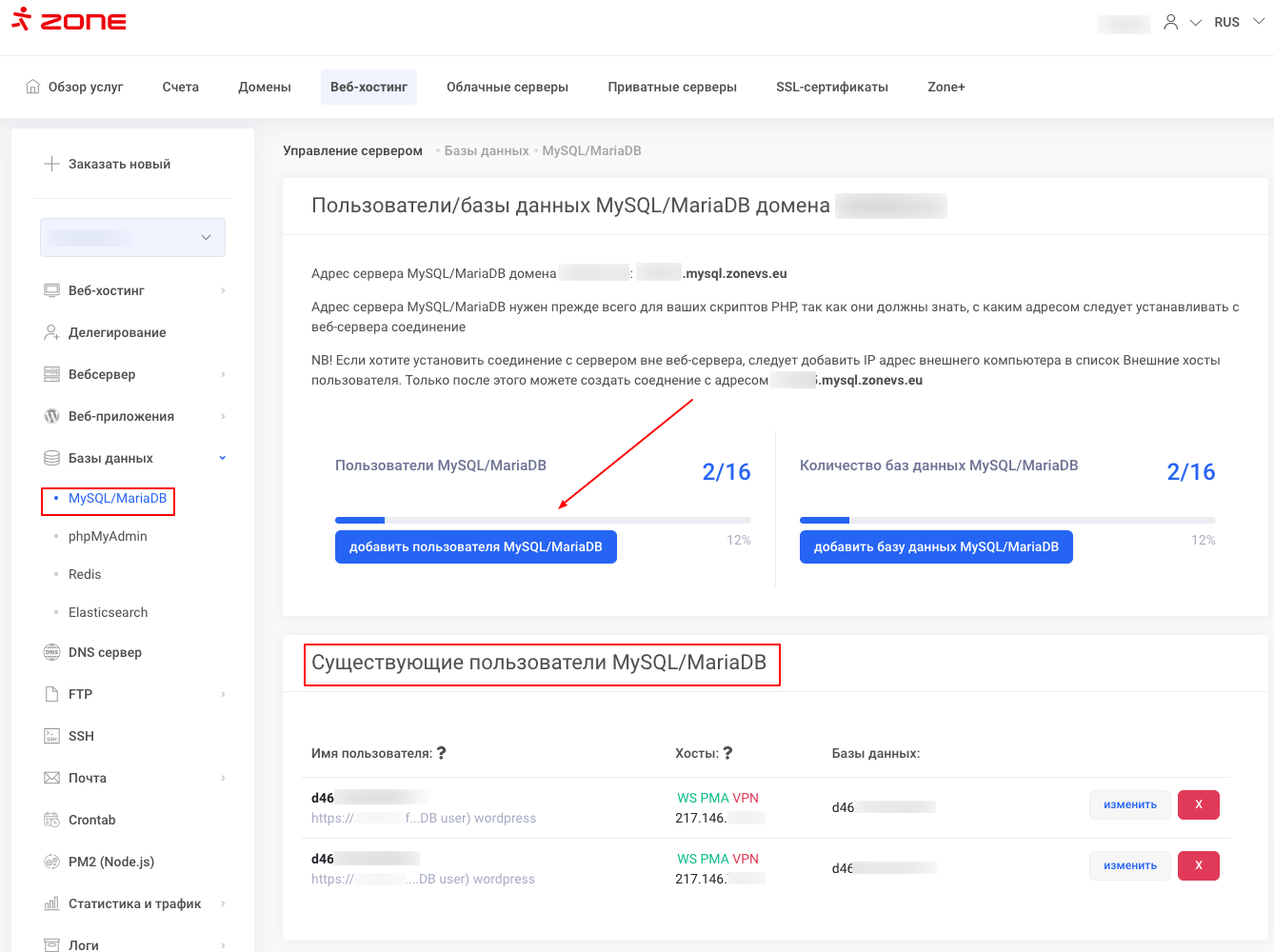 Пользователей баз данных MySQL/MariaDB можно найти в панели управления виртуального сервера, перейдя в меню Базы данных -> MySQL/MariaDB -> Существующие пользователи MySQL/MariaDB.