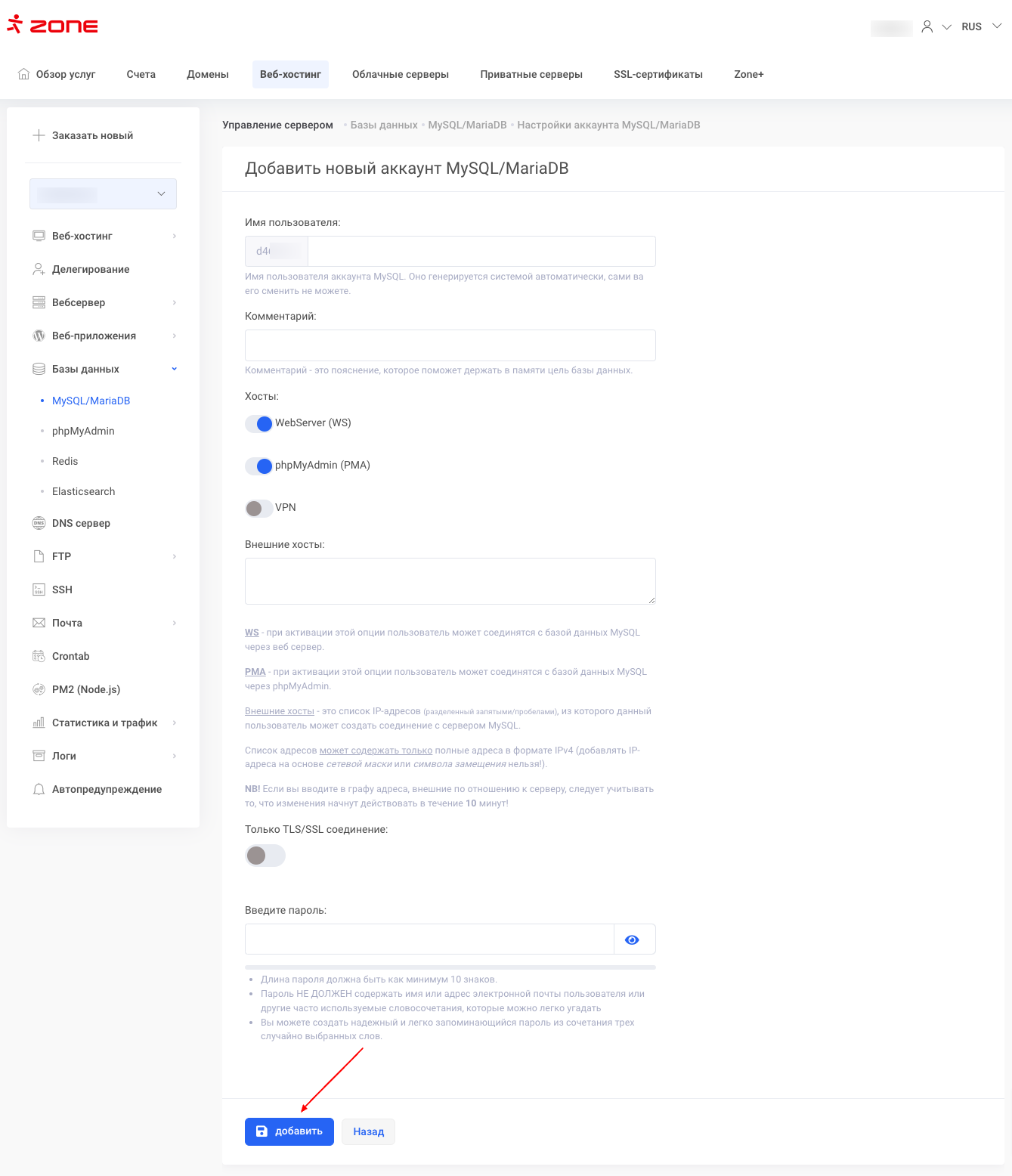 Новый пользователь может быть добавлен нажав на кнопку Добавить пользователя MySQL/MariaDB.