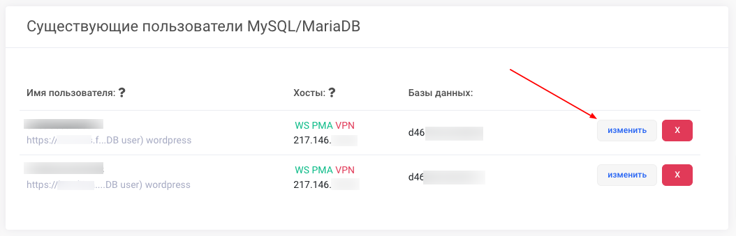 Если существующий пароль пользователя базы данных неизвестен, его можно изменить. Для этого щелкните в разделе Существующие пользователи MySQL/MariaDB нажмите около нужного пользователя базы данных изменить.