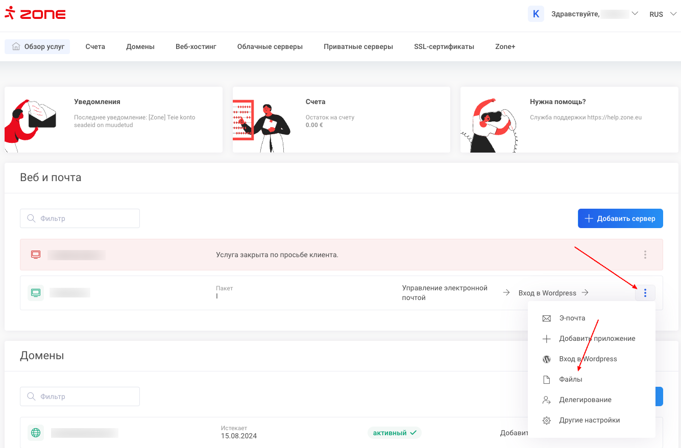 Информация о пользователе для базы данных WordPress находится на веб-сервере в файле wp-config.php. Для того, чтобы найти информацию сначала войдите на сервер через WebFTP. На странице обзора услуг около соответствующего сервера нажмите на меню действий (три точки) и выберите Файлы.