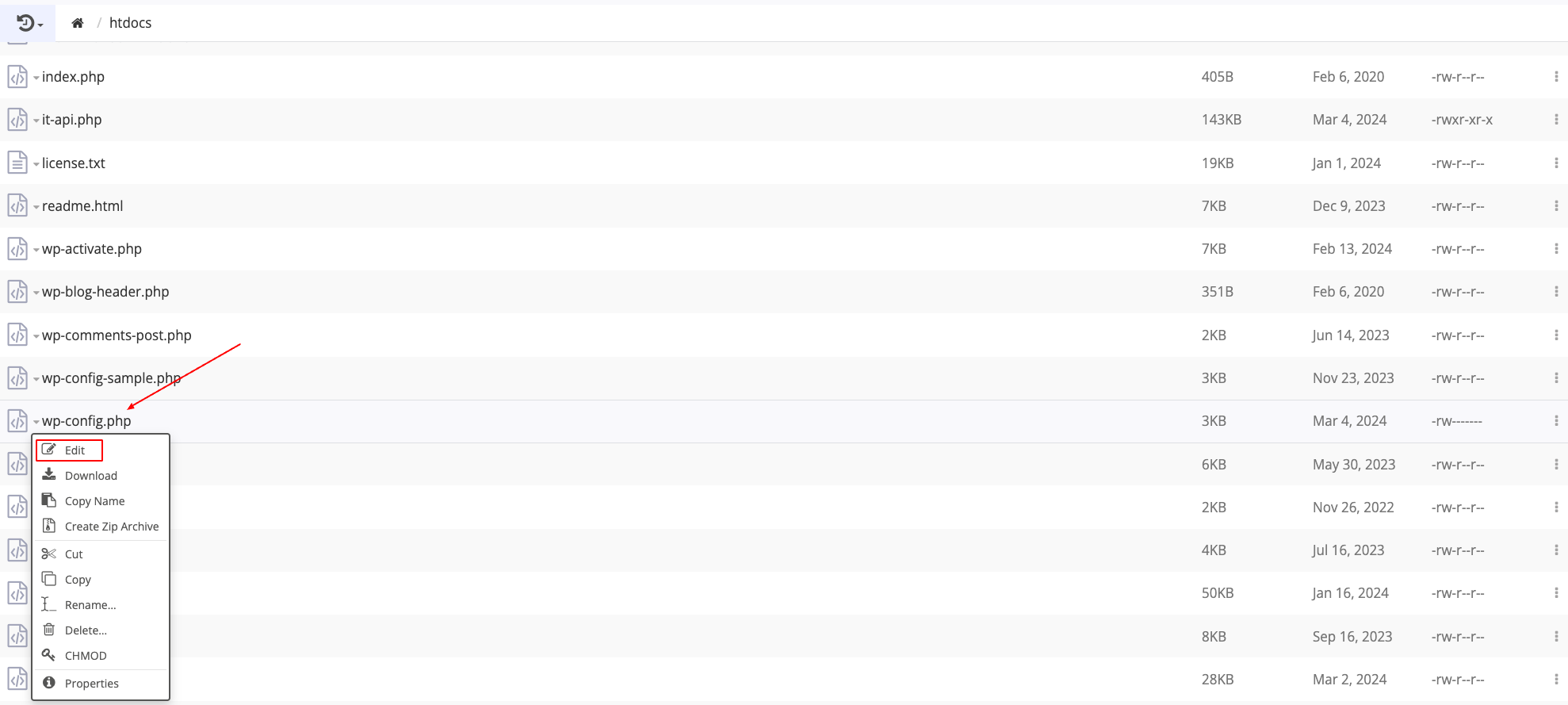 В папке htdocs найдите файл wp-config.php, щелкните на нем и выберите Edit.