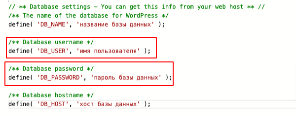 Кроме того, в файле можно найти название базы данных, связанной с WordPress, а также имя хоста сервера базы данных.