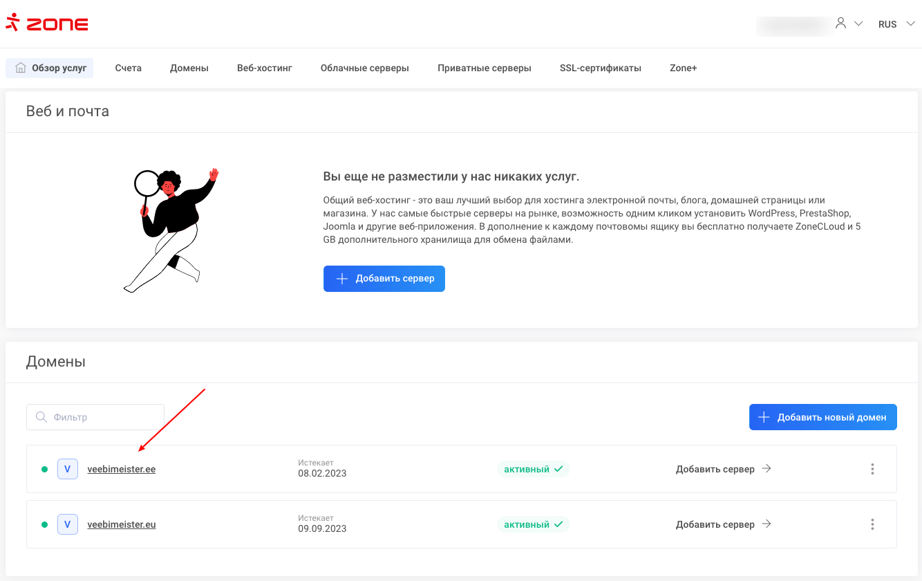 Истечение срока действия домена не приводит к прекращению услуги виртуального сервера, которая является бессрочной. Если у вас используется виртуальный сервер на домене с истекшим сроком действия, пожалуйста, сообщите нам о своем желании закрыть услугу по адресу info@zone.ee. Вы также можете закрыть сервер в панели управления Мой Zone  в разделе Веб-хостинг, выбрав в меню  Пакет и расчетный период