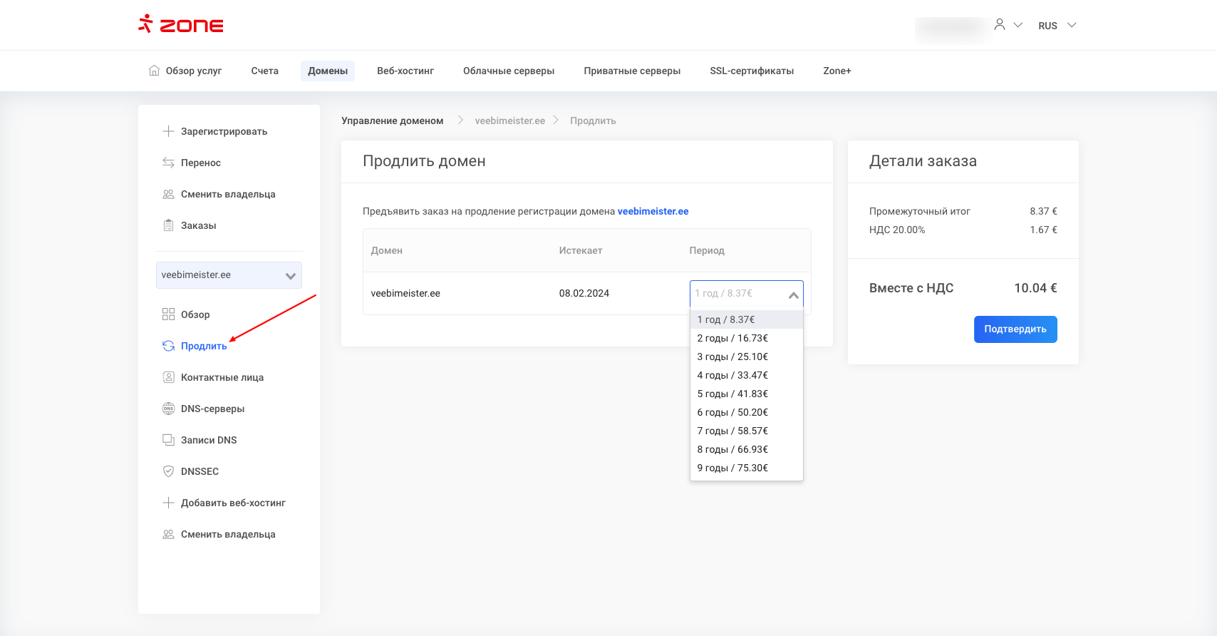 Разные домены имеют разные максимальные сроки продления. Некоторые домены могут быть продлены только на один год, другие – на десять лет. В раскрывающемся меню периода можно выбрать период, на который необходимо продлить домен.