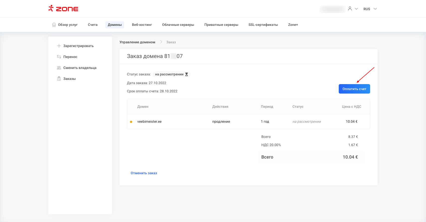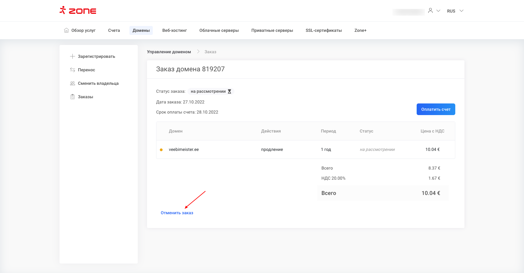 В этом случае вы можете отменить заказ на продление в разделе обзора домена, нажав на кнопку  Посмотреть заказ.