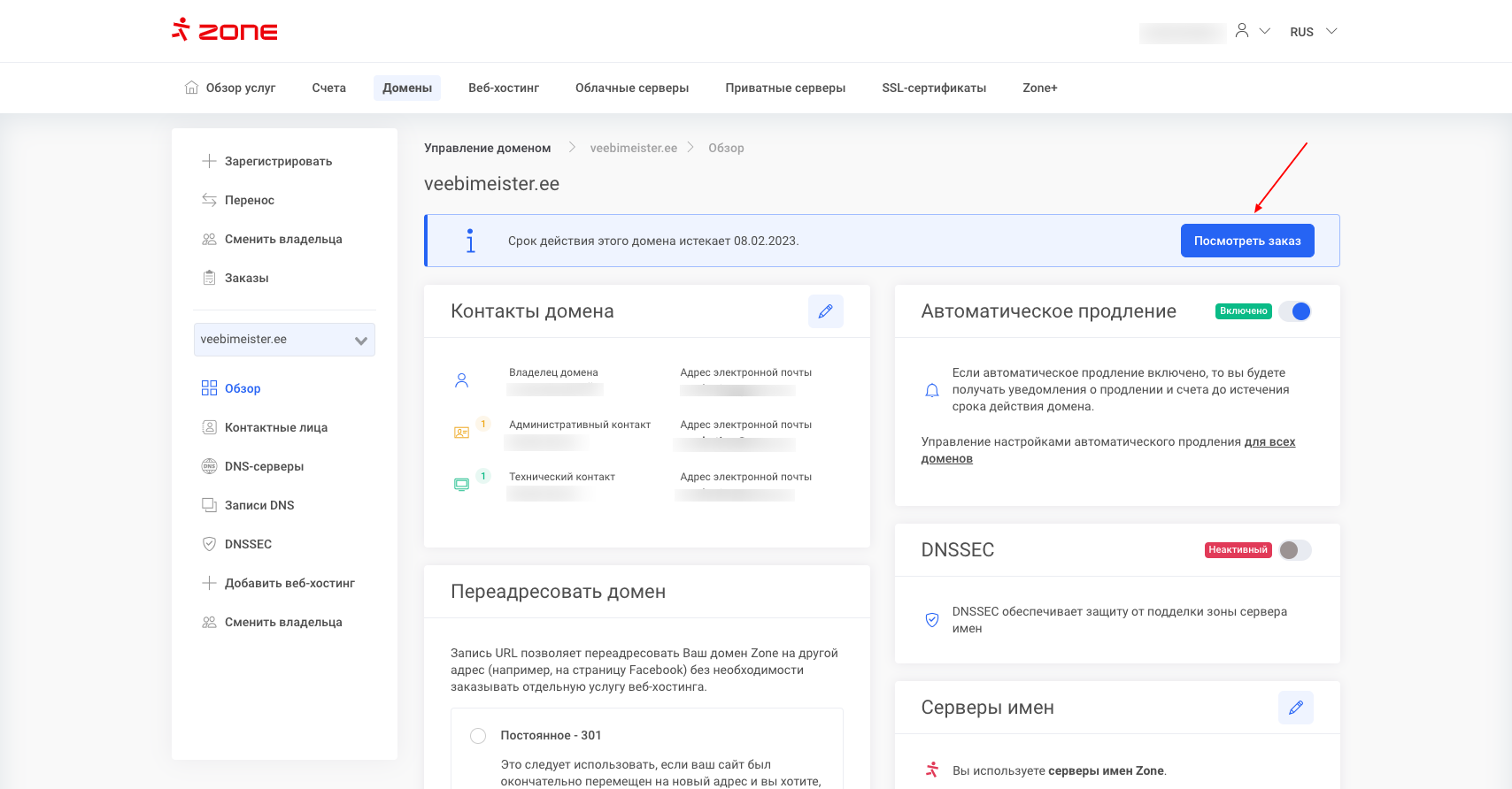 Вы также можете продлить домен до предъявления нами автоматического заказа, войдя в Мой Zone и нажав на имя домена странице Обзор услуг.